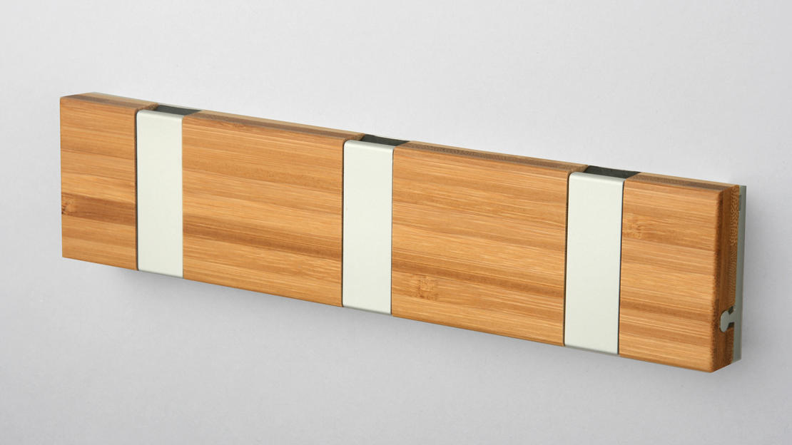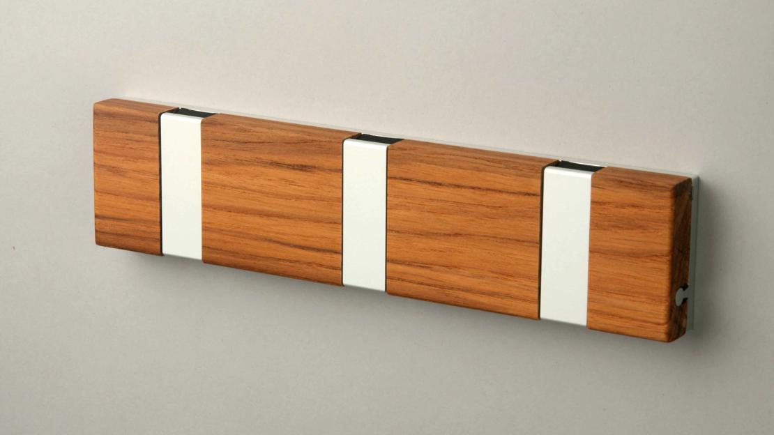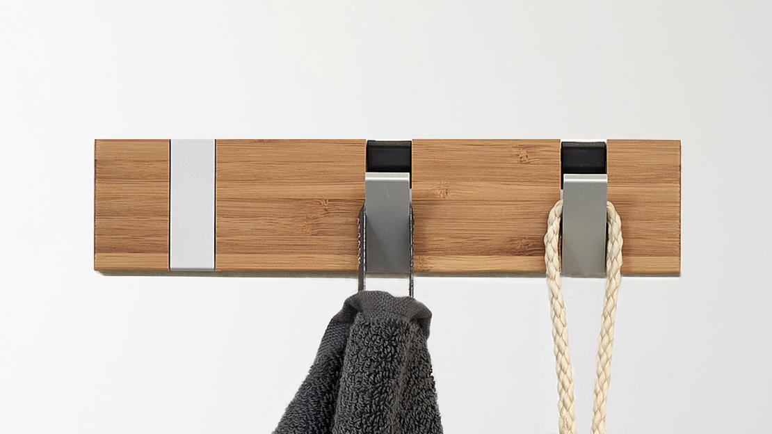 Knagerække med 3 knager i grå eller sort, og hvor du kan vælge mellem flere træsorter og farver.