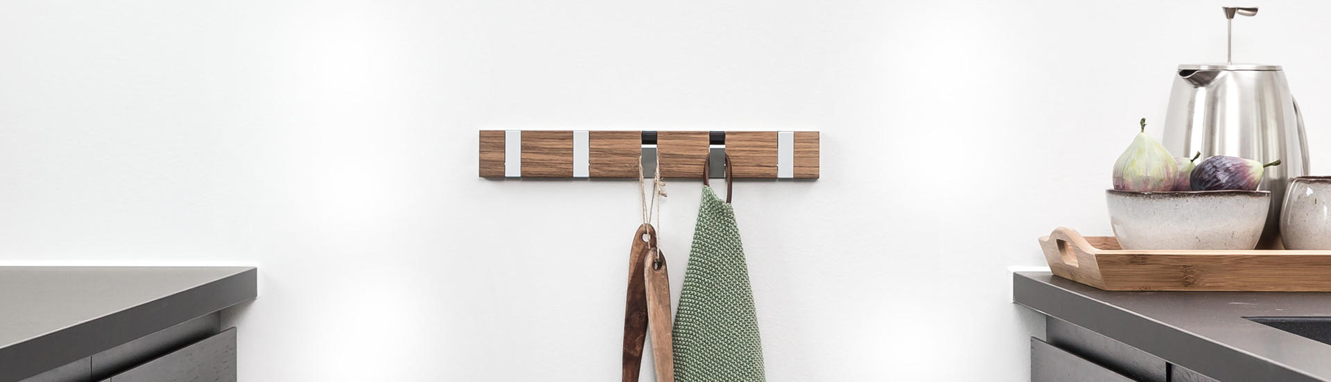Knagerække med 5 knager i grå eller sort, og hvor du kan vælge mellem flere træsorter og farver.