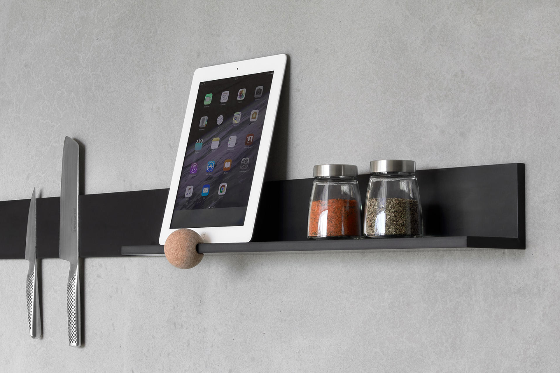 På STRAIGHTS krydderihylden får man plads til sin tablet, kogebog, krydderier mv. Hylden er fremstillet i DuPontTM Corian® og kan dermed bruges både i køkken og bad.