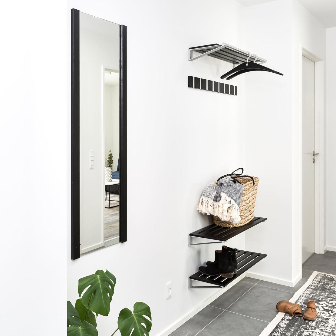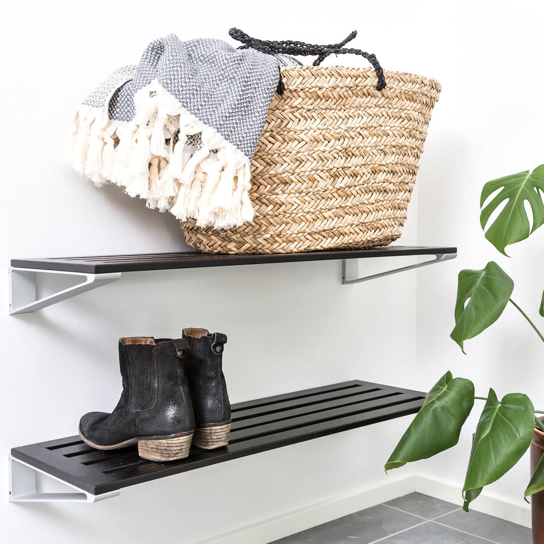 En elegant skohylde som fås i 4 længder. Vælg mellem flere træsorter og lakeret hvid, med grå eller sorte hyldeknægte.