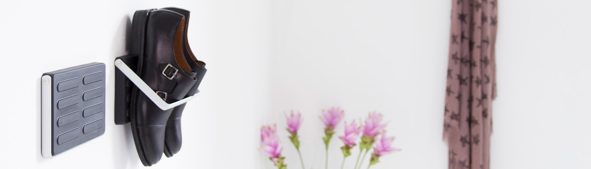 Designduoen Harrit og Sørensen har designet Zjup skoholderen (shoes up) i klassisk og minimalistisk design, der på en enkel, let og elegant måde holder styr på skoene i entréen eller garderoben.