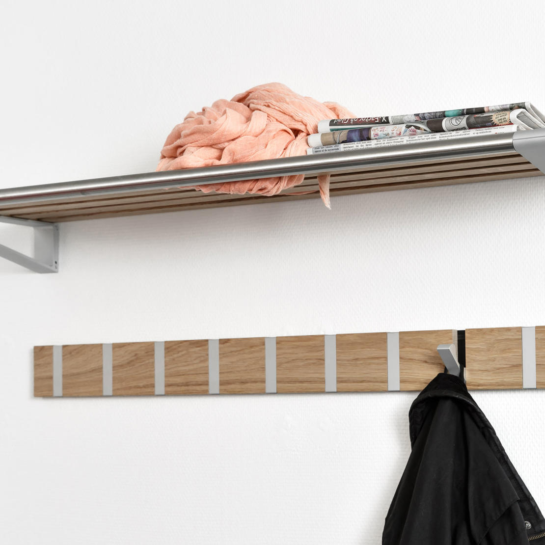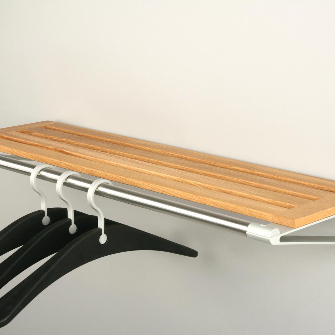 Unsere elegante Hutablage ist mit einer Bügelstange zum Aufhängen von Jacken und Mänteln gestaltet, auf der Ablage selbst können Taschen, Handschuhe, Zeitungen oder anderes Zubehör abgelegt werden.
