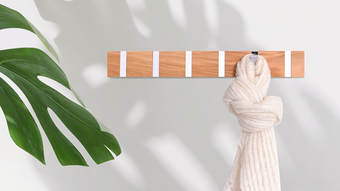 Thorkild fand jedoch keine auf dem Markt, die seinen Ansprüchen genügte. So ging er in seine Garage, um selbst eine Garderobenleiste zu zimmern. Ziel war es, viele Haken auf ein kurzes Stück Holz zu bringen. Der Prototyp wurde niemals aufgehängt, der Prozess brachte jedoch eine Vision ins Rollen. Nach dem anfänglichen Designprozess entstand die endgültige Version. Jeder Haken wurde mit einer Federung gestaltet, damit die ungenutzten Haken in die Garderobenleiste einklappen können. Wenn sie gerade nicht in Gebrauch sind, ragen die Haken nur 18 mm in den Raum hinein – somit ist die Leiste nicht nur ansehnlich und platzsparend, sondern auch sicher.