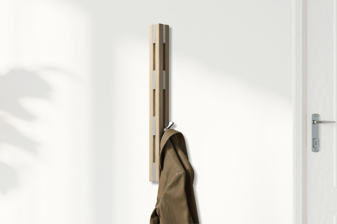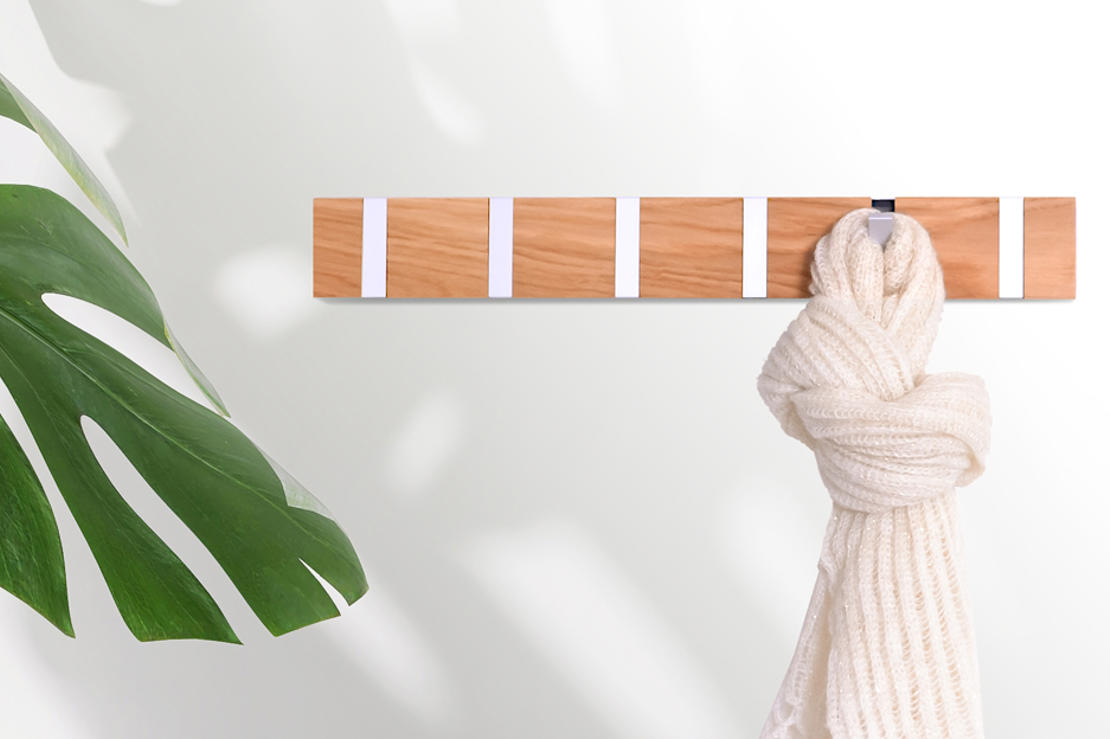 KNAX horizontal est un portemanteau intemporel, primé, idéalement conçu pour les espaces restreints, grâce à ses patères sur ressort qui reviennent en place lorsqu'elles ne sont pas utilisées.