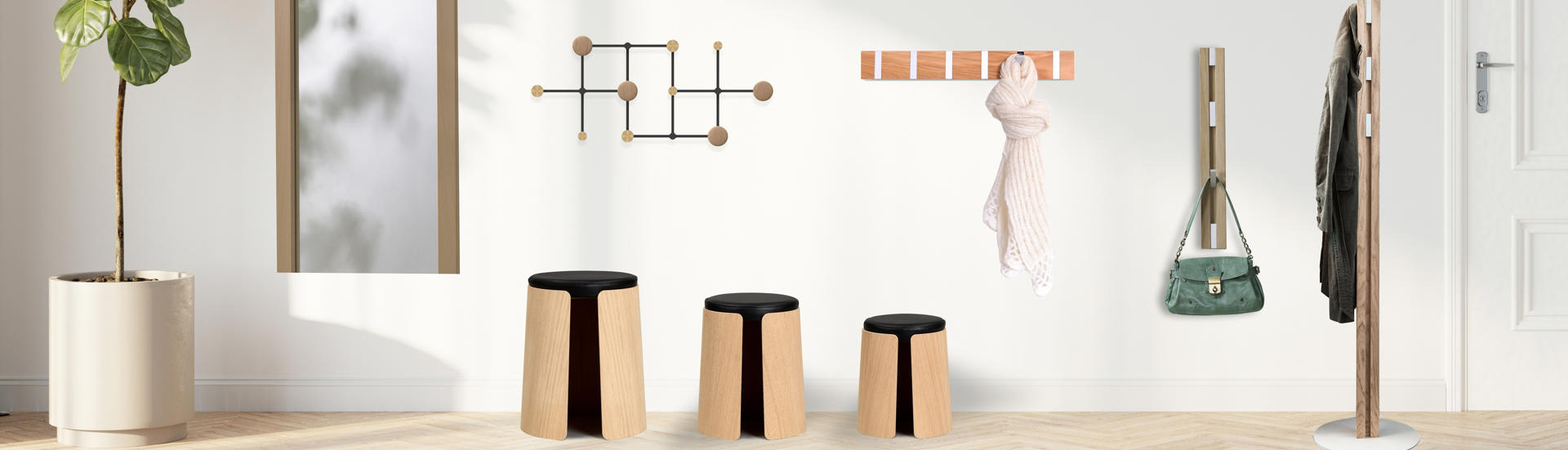 Le porte-manteau sur pied KNAX au design scandinave moderne s'intègre parfaitement à l'accueil, dans une salle d'attente ou dans un bureau.