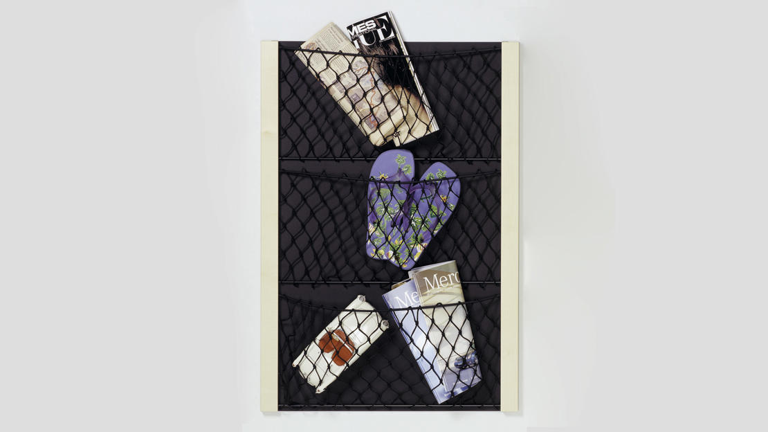 Filet mural simple et léger, destiné à ranger des gants, des écharpes ou des journaux.