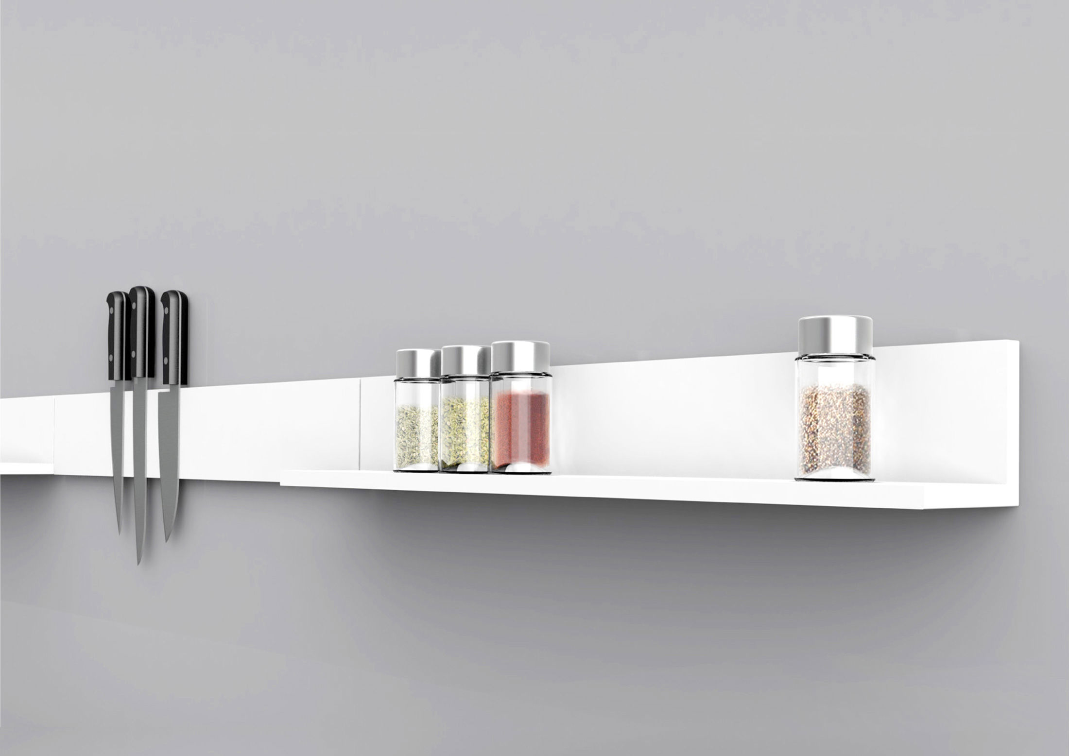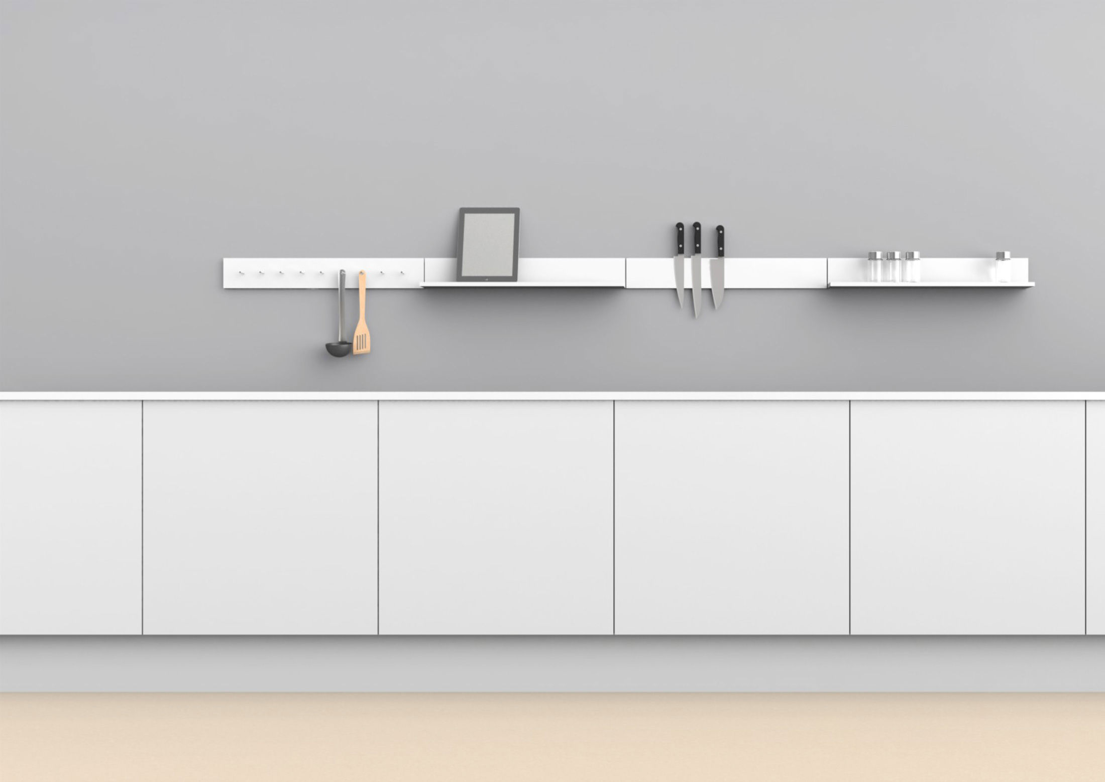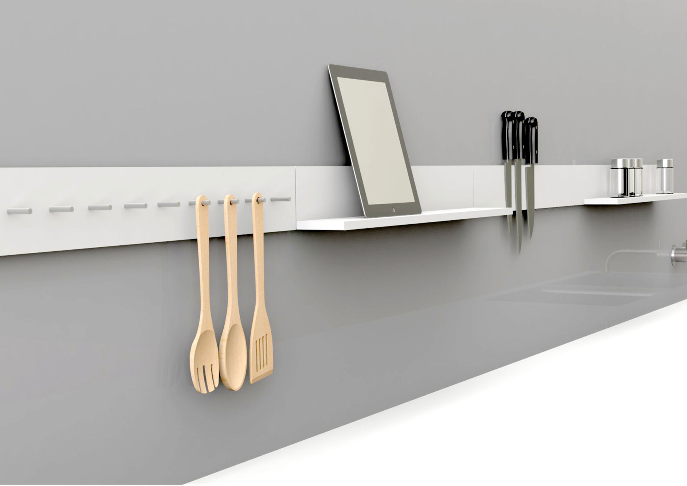 Arkitekt Lars Vejen har designet en serie modulære paneler til æstetisk og praktisk opbevaring i f.eks. køkken. Modulerne former en lige vandret linje, og supplerer dermed et interiør med et enkelt og stærkt grafisk element.