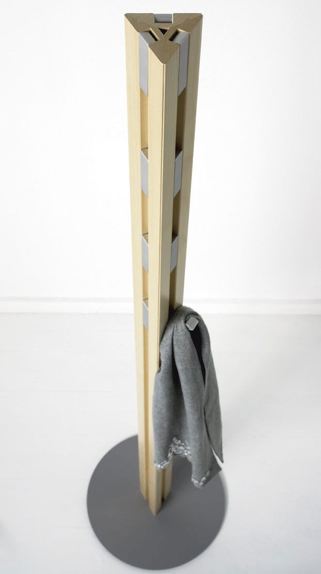 With its simple expression, the hall stand is still very functional, but very complex to make. The narrow hooks provide many storage options, but are hidden in the triangle-shaped base when the hooks are not in use.