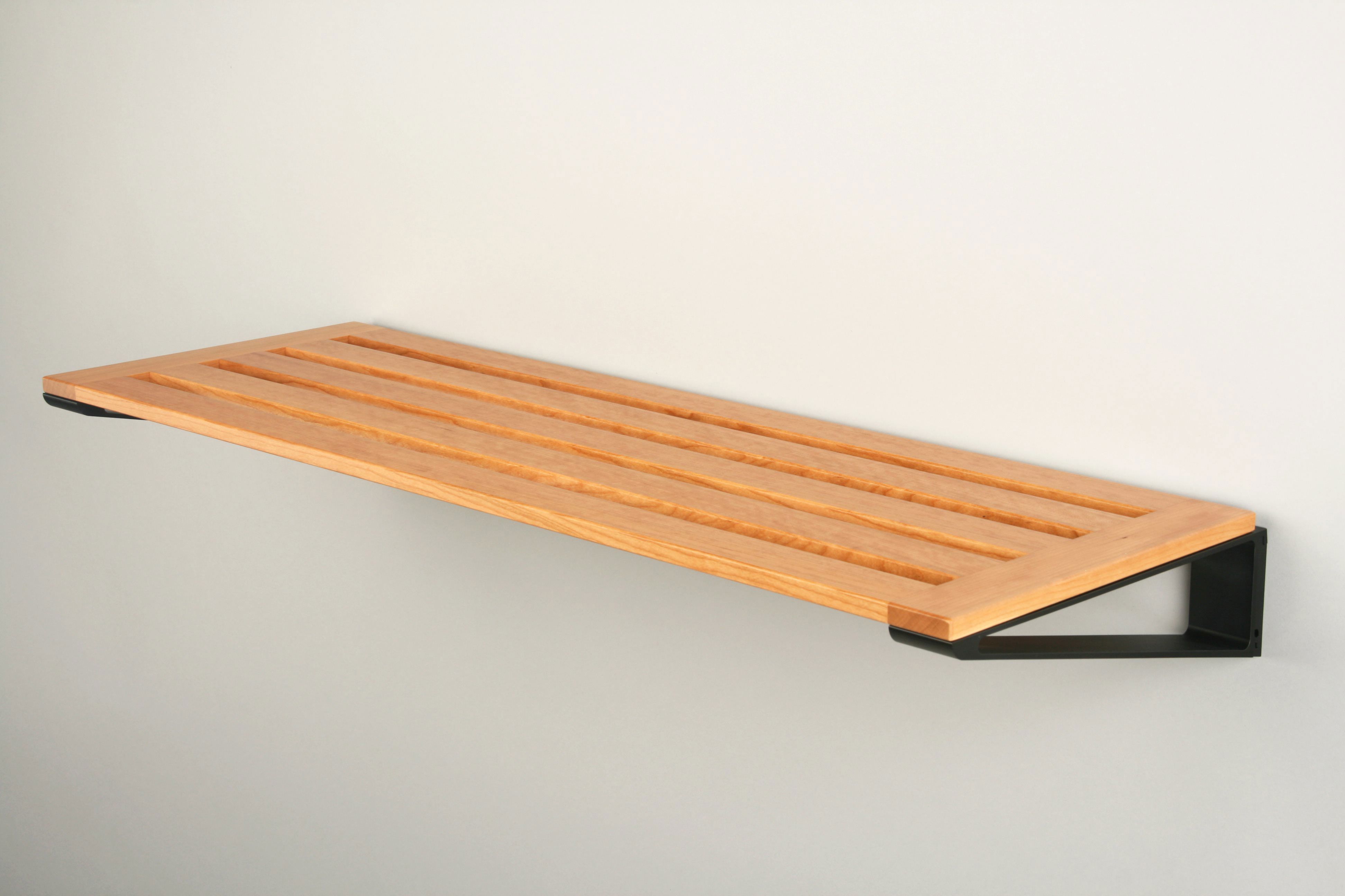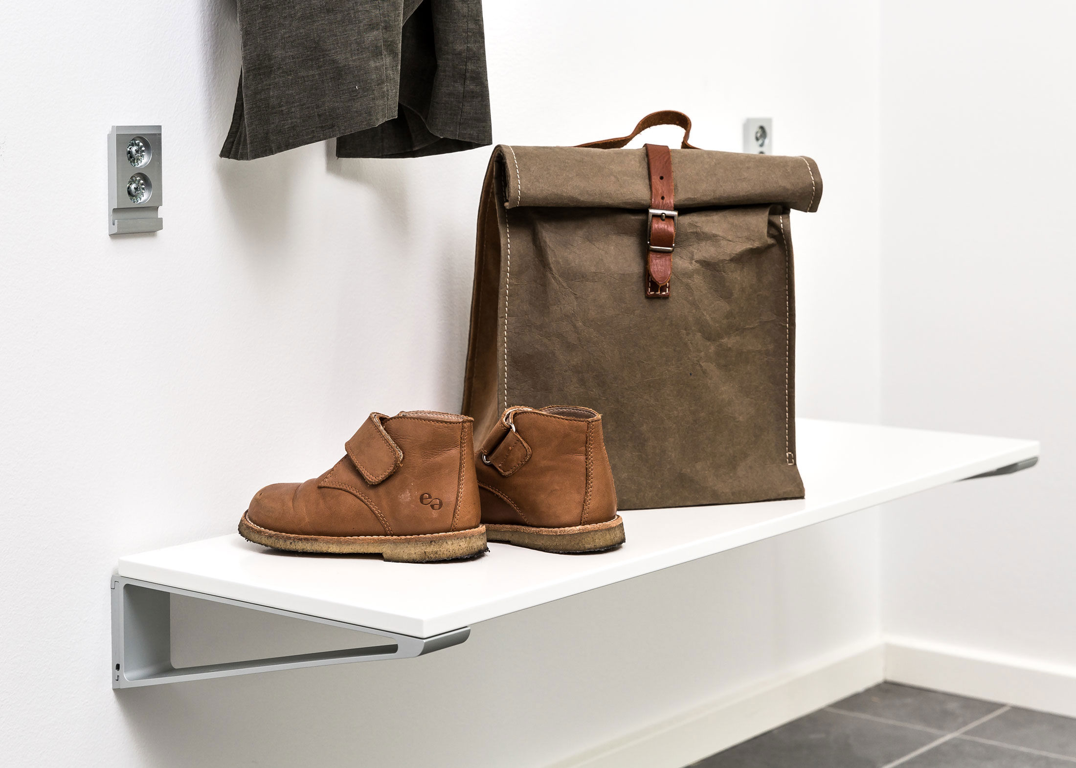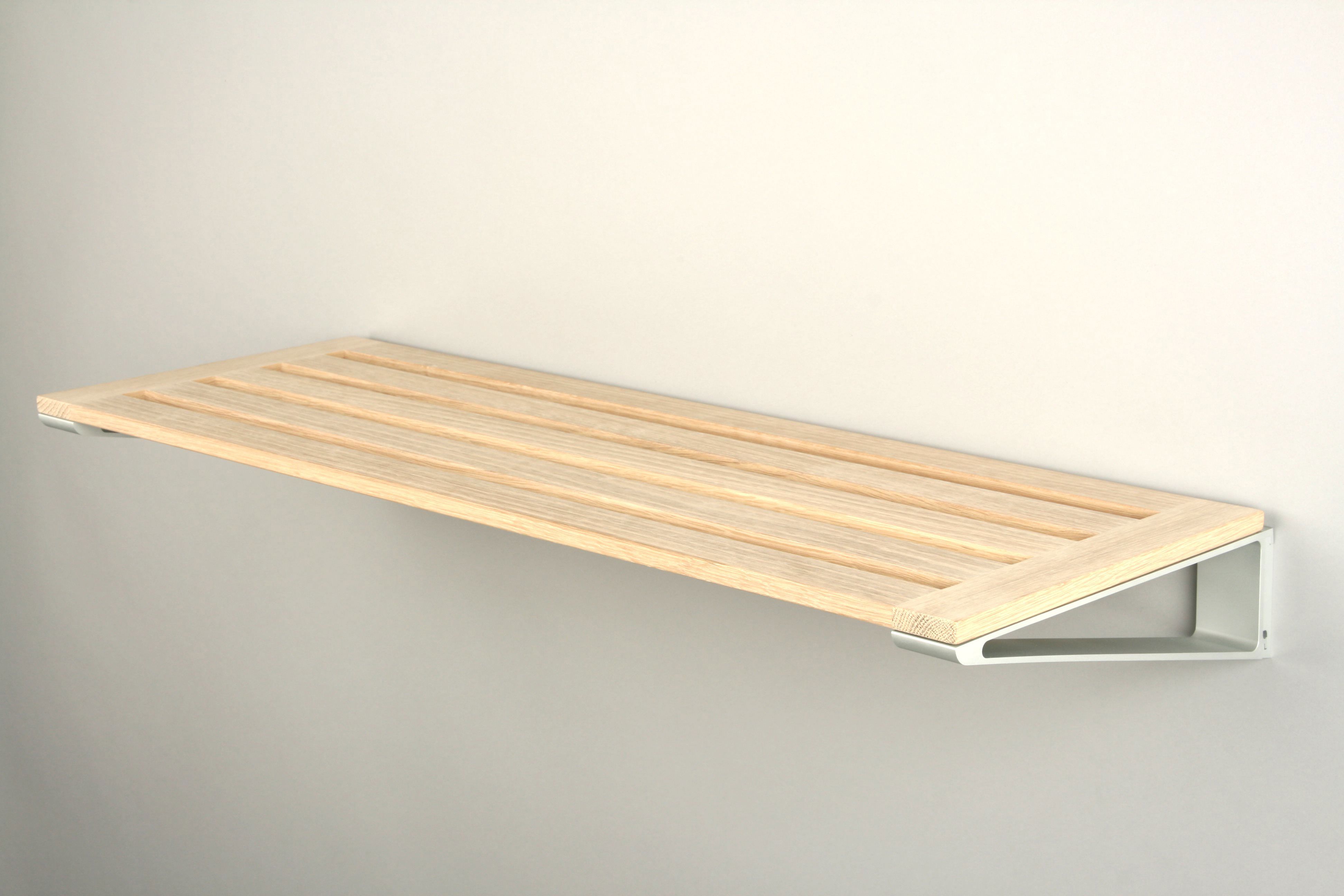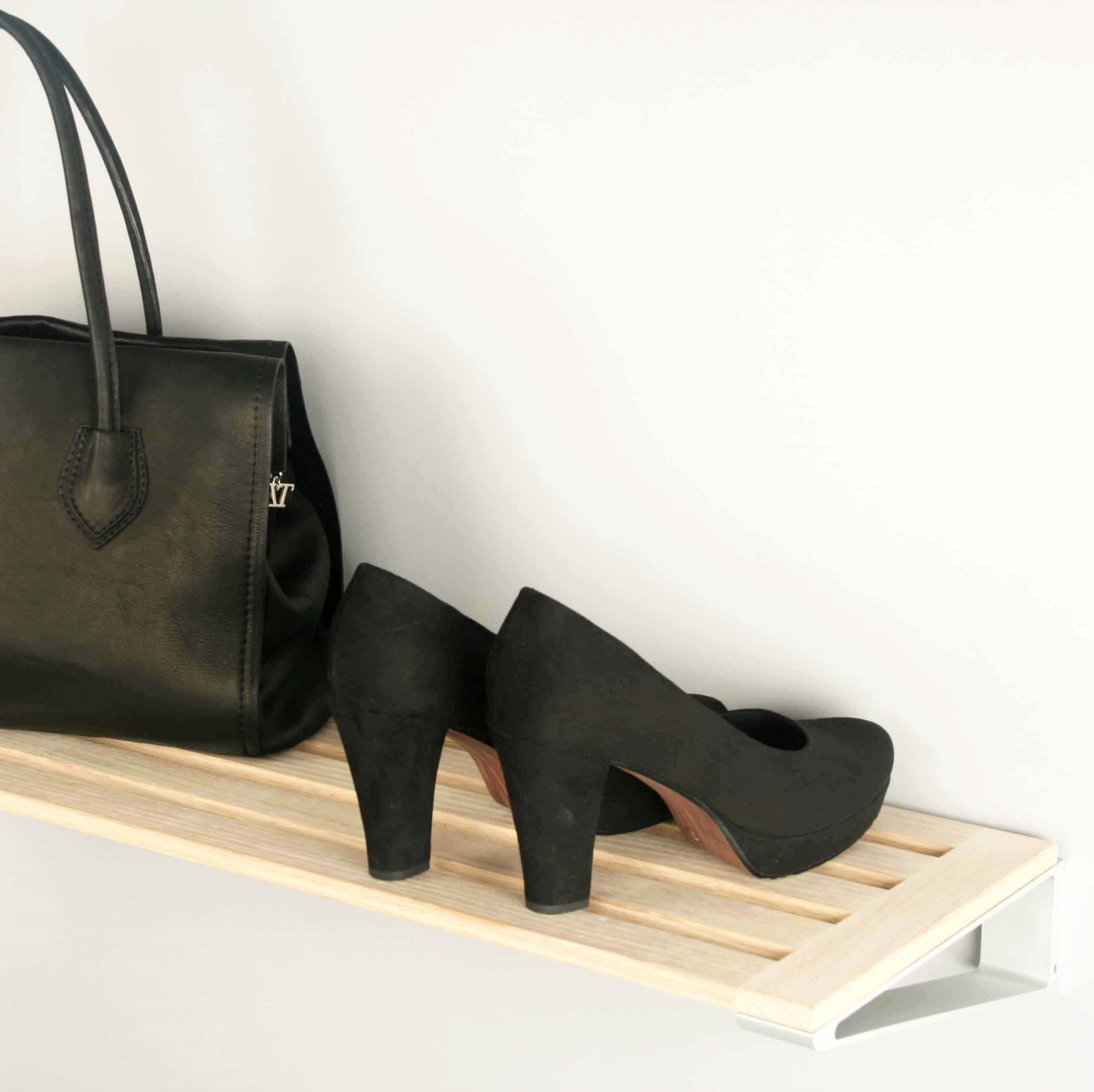 An elegant shoe rack available in four lengths. Choose from many types of wood and lacquered white, with grey or black shelf brackets.